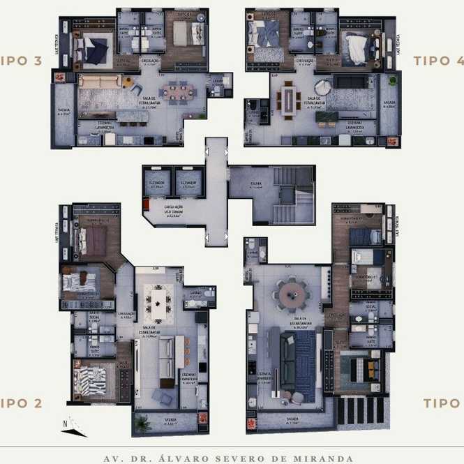 Apartamentos de 3 dormitórios, com 1 suíte, sala de estar e jantar, lavabo, sacada com churrasqueira, cozinha, área de serviço e box duplo.