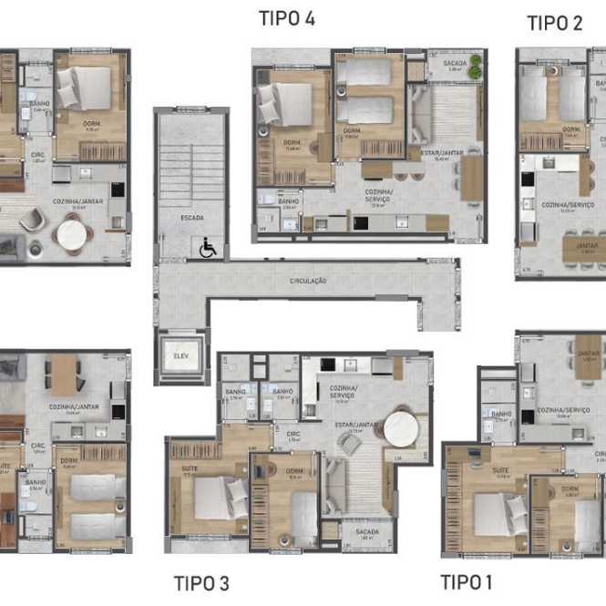 Apartamentos de 3 e 2 dormitórios, sala deestar e jantar, sacada com churrasqueira, suíte, banheiro social e garagem.