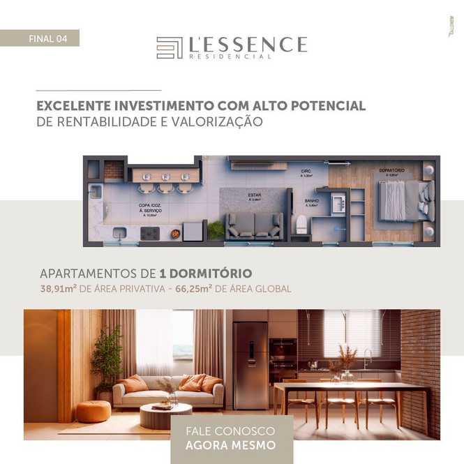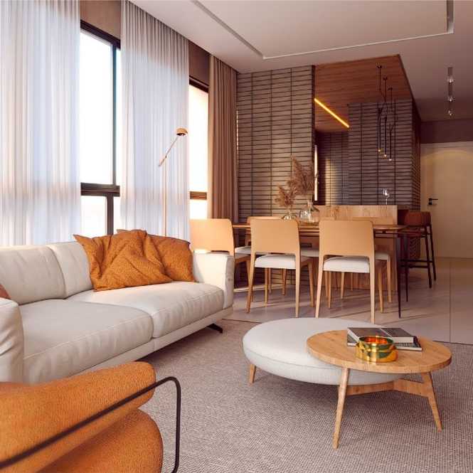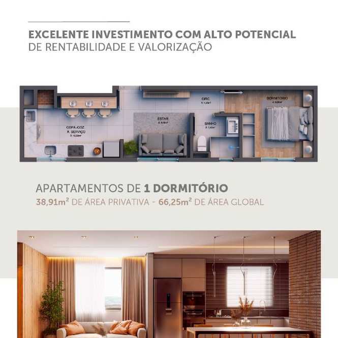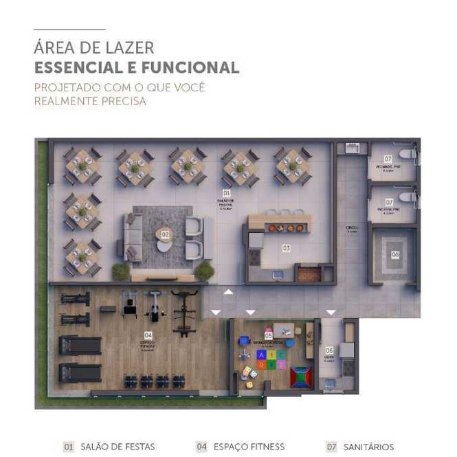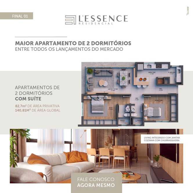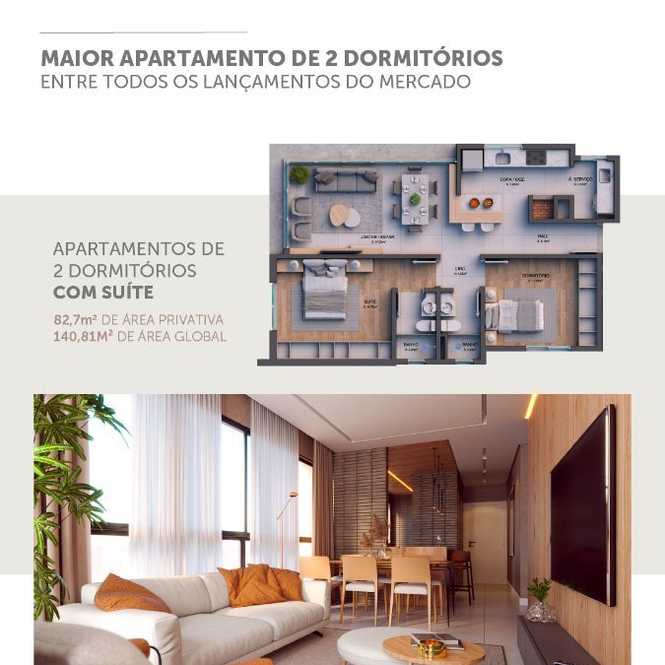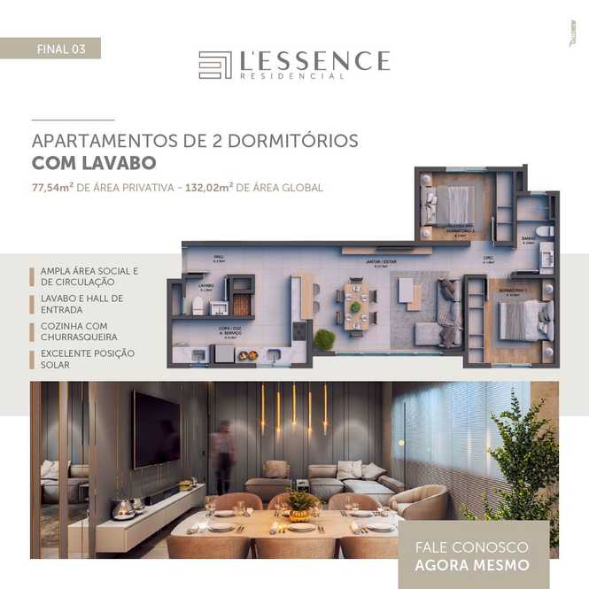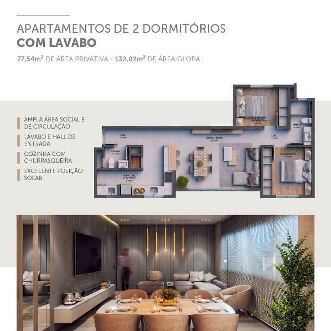 Apartamentos com 2 dormitórios (1 suíte), sala 2 ambientes, 2 banheiros, cozinha, churrasqueira, área de serviço e garagem.