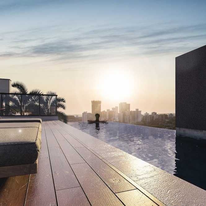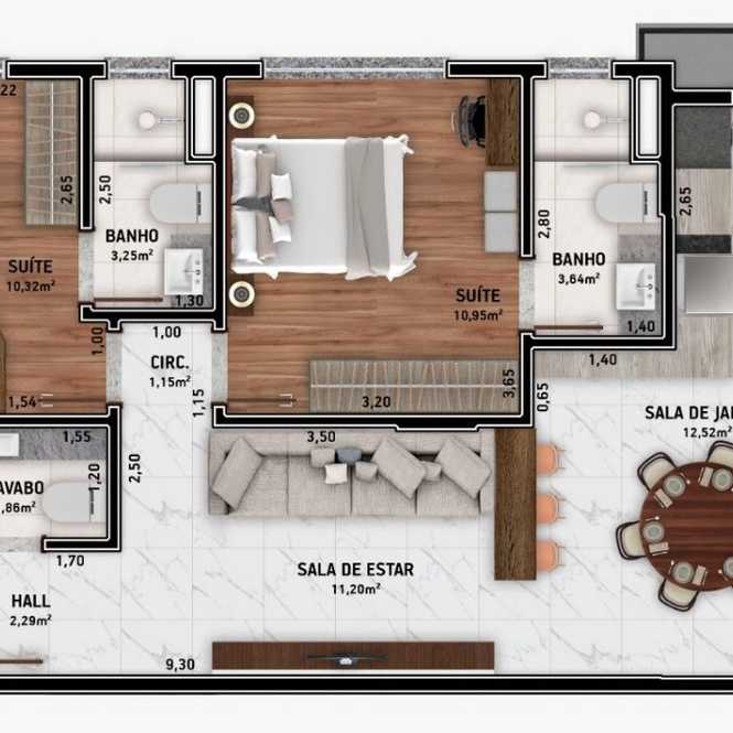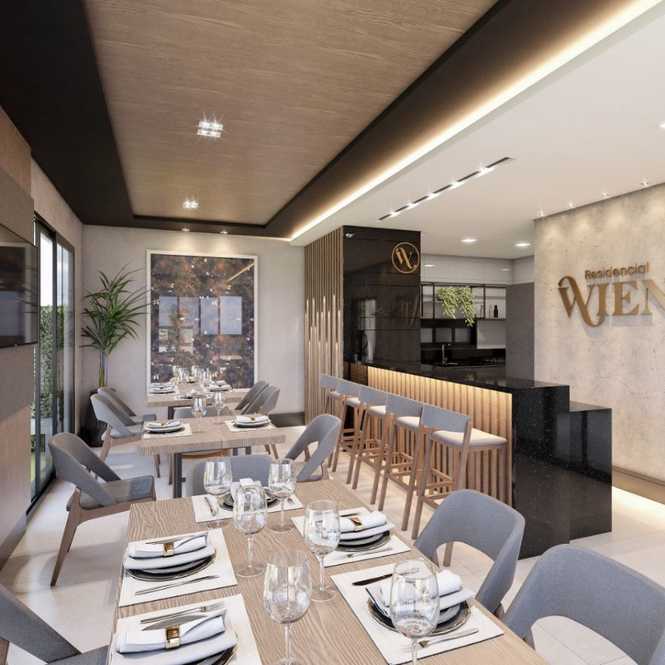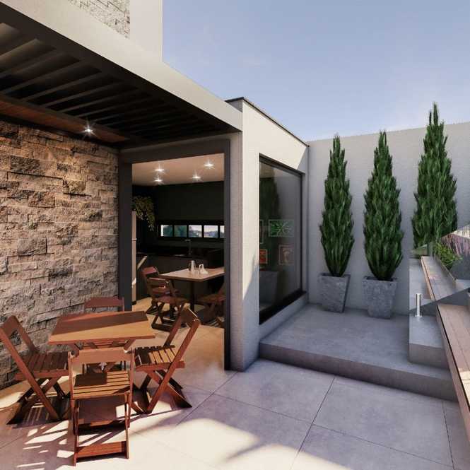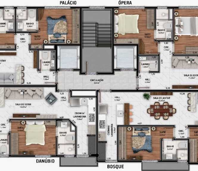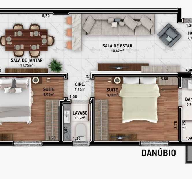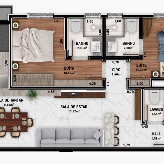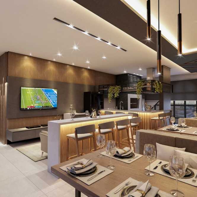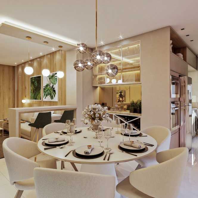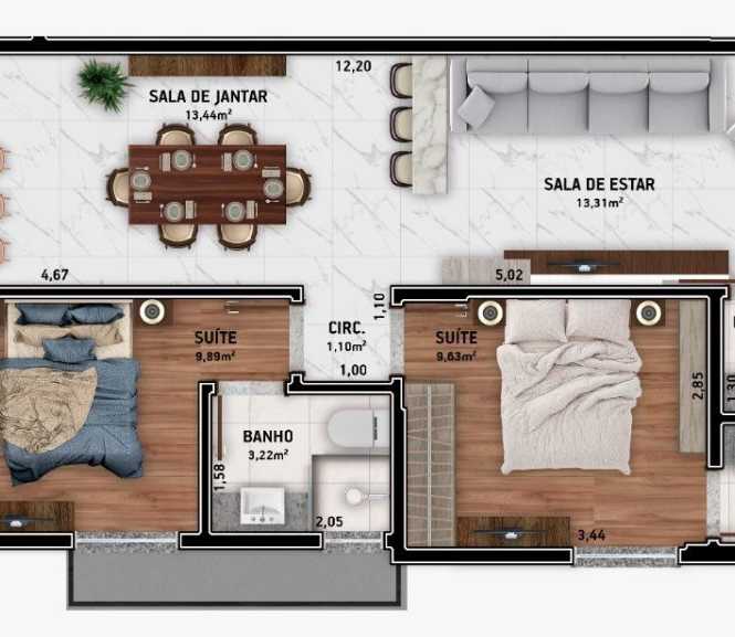 Apartamentos com 2 dormitórios, (suítes), sala, sacada com churrasqueira, 2 banheiros, cozinha, área de serviço e garagem.
