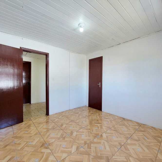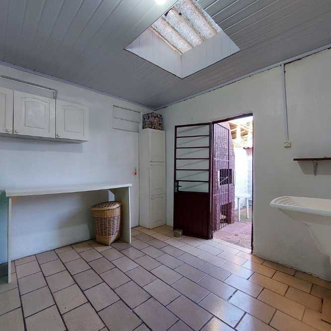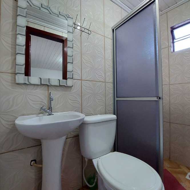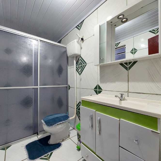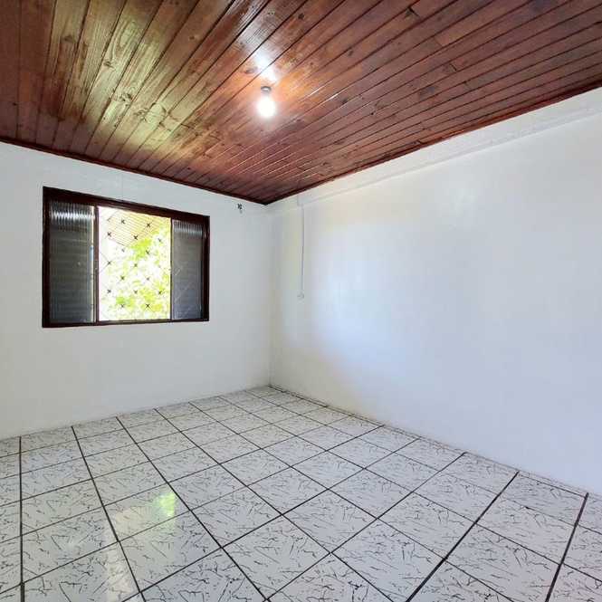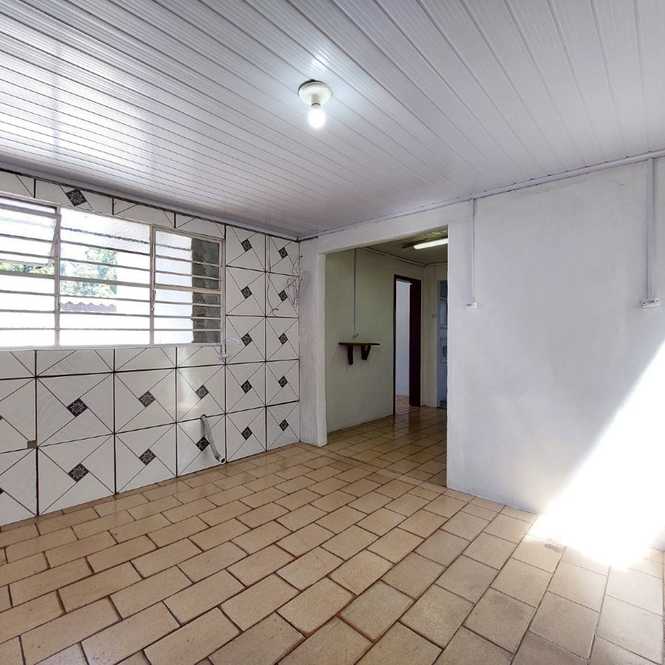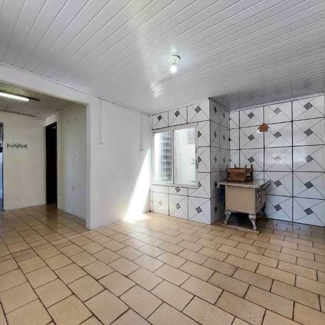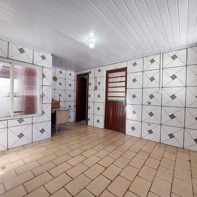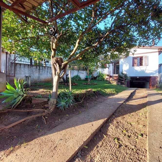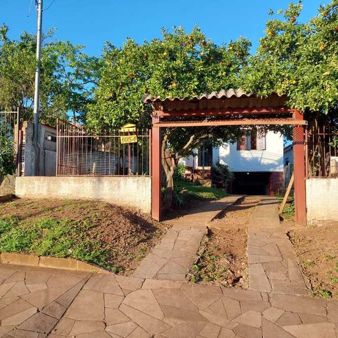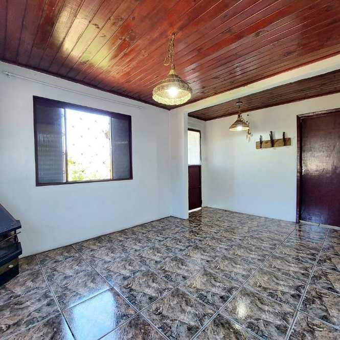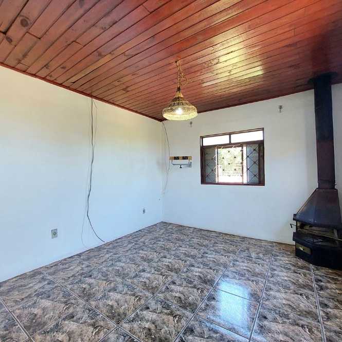 Casa de alvenaria com 3 dormitórios, 1 suíte, banheiro social, sala com lareira, cozinha, lavanderia e garagem.