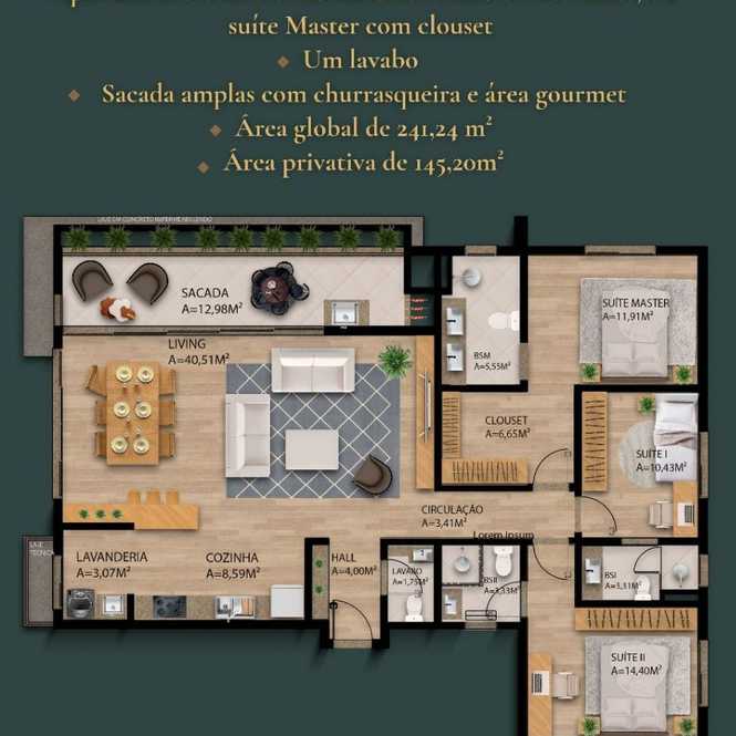 Apartamentos com 3 suítes, suíte master com closet, lavabo, sacada grande com churrasqueira e área gourmet, sala, cozinha e área de serviço.