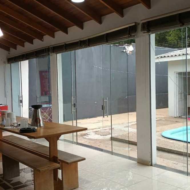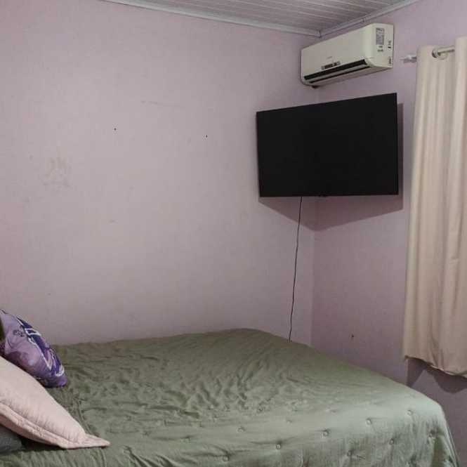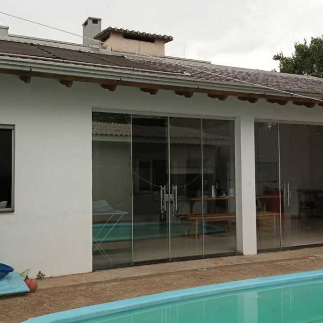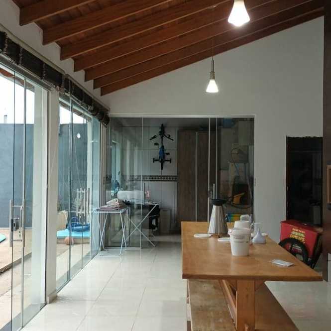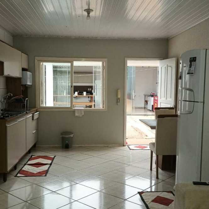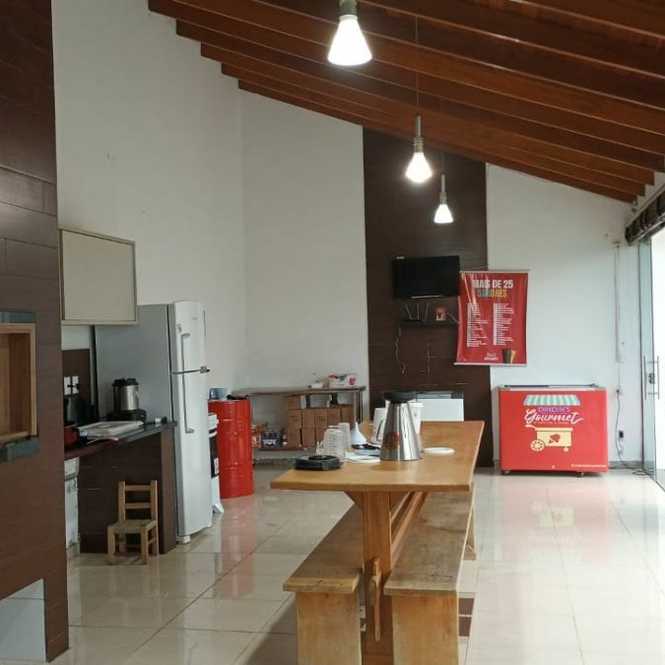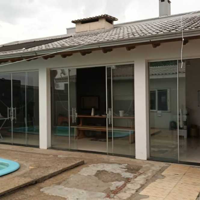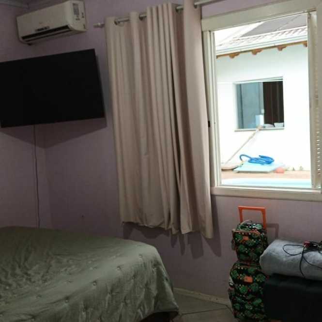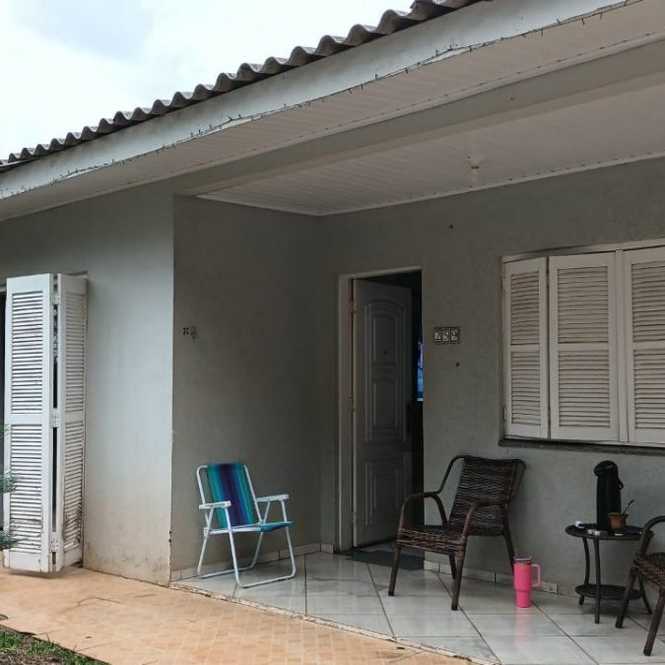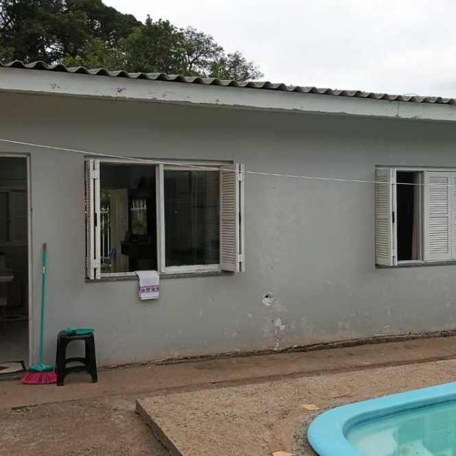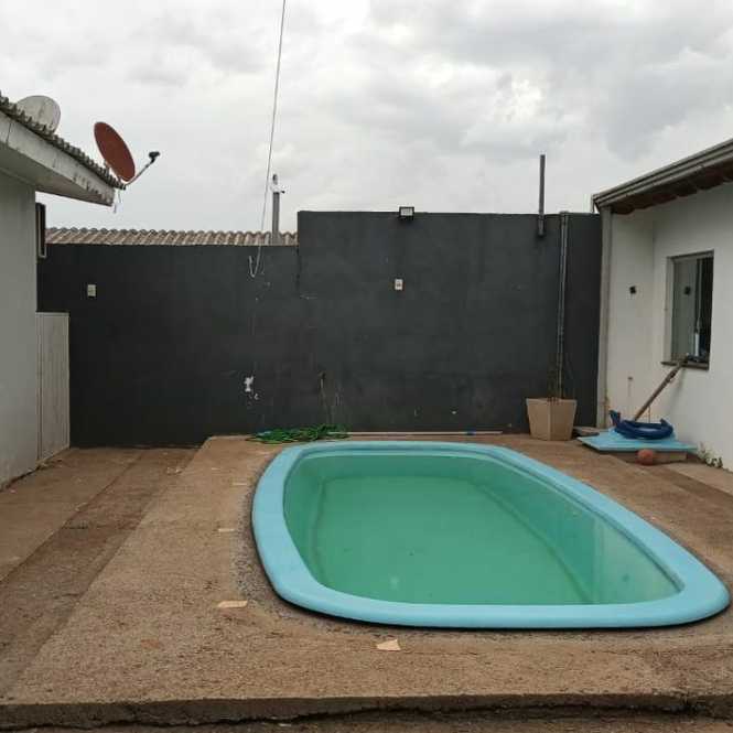 Casa de alvenaria com 2 dormitórios, sala, cozinha, banheiro, varanda, píscina, salão de festas com churrasqueira, banheiro e lavanderia.