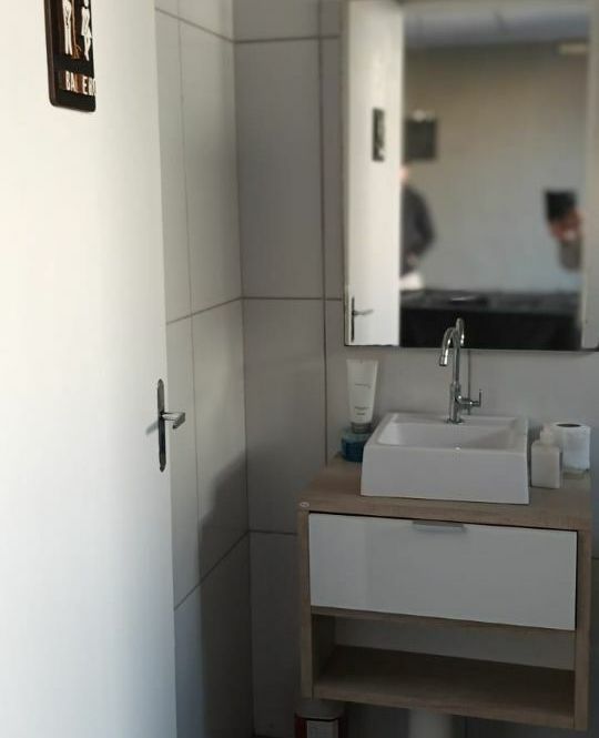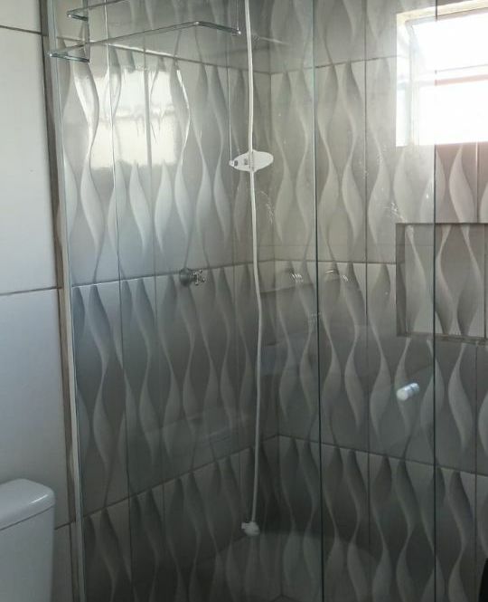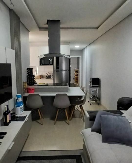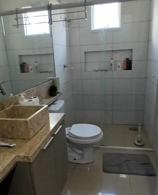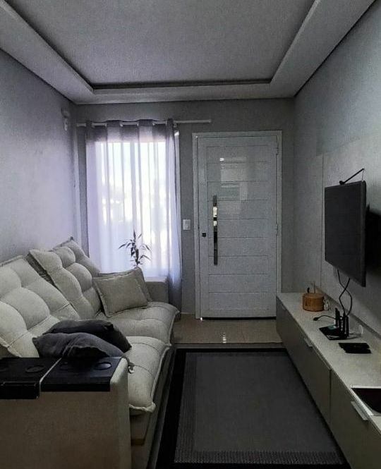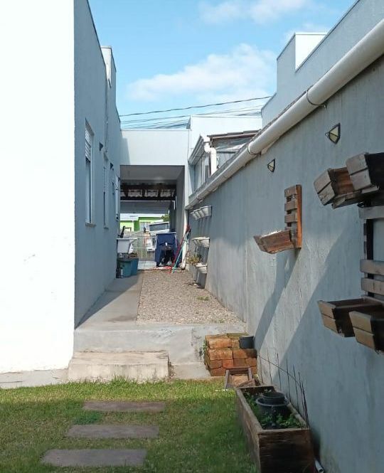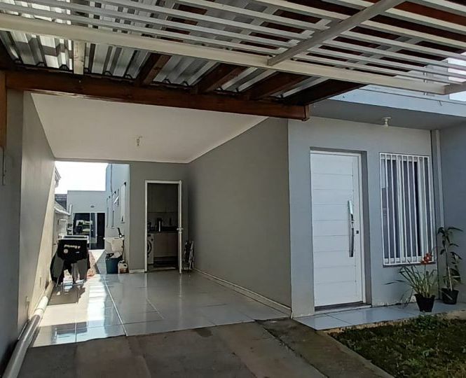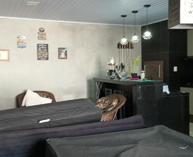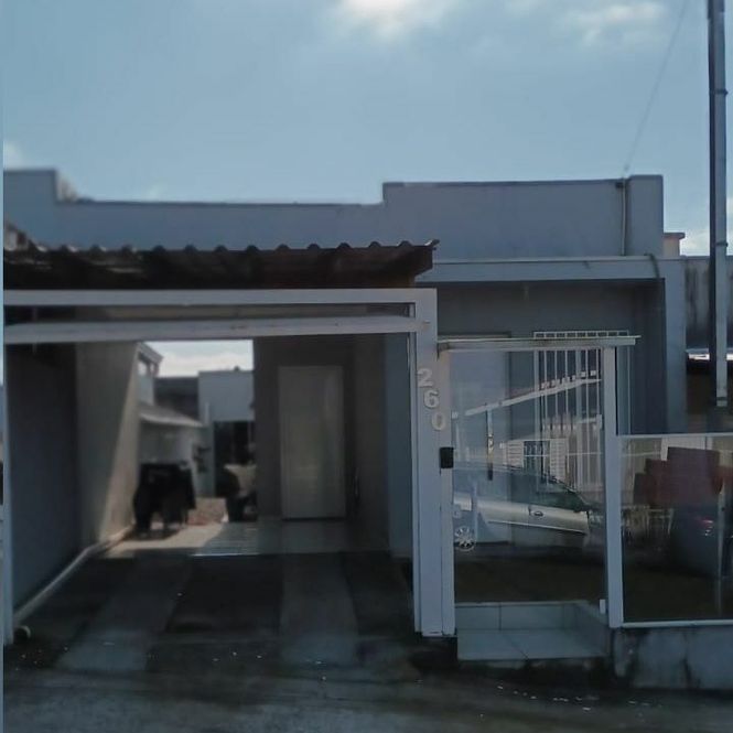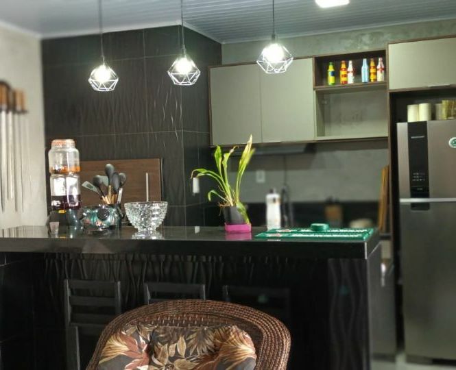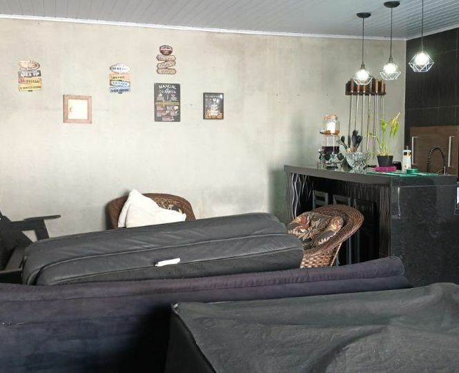 Casa de alvenaria com 2 dormitórios, sala, cozinha, banheiro, área de serviço, mais espaço gourmet na parte de trás, com churrasqueira, pia, bancada e banheiro.