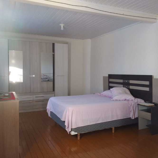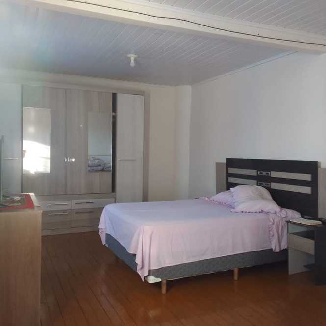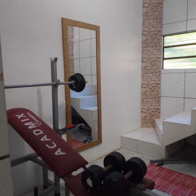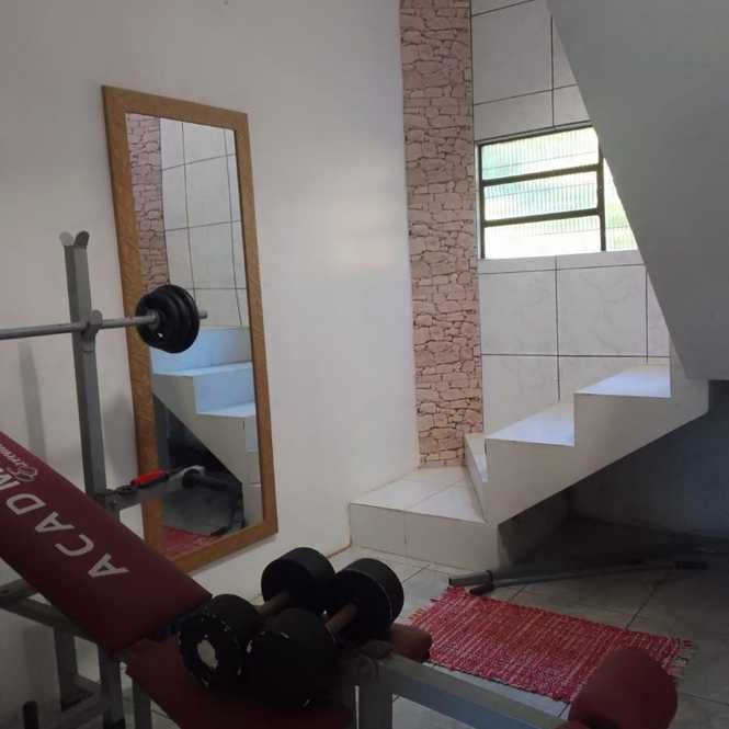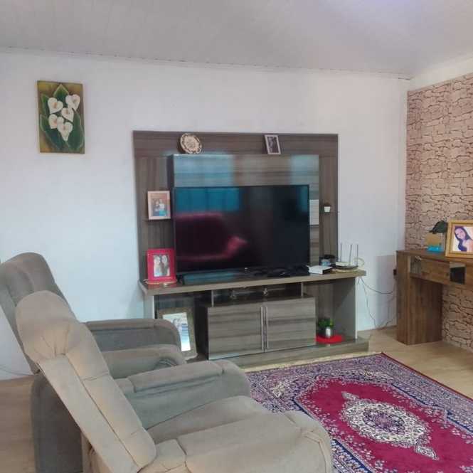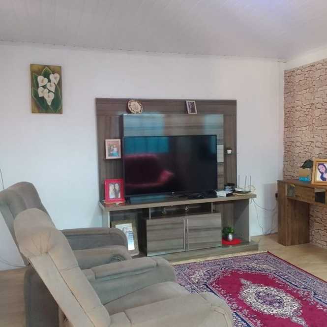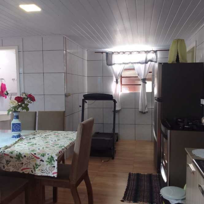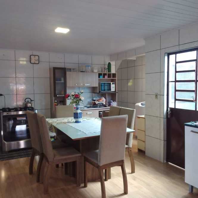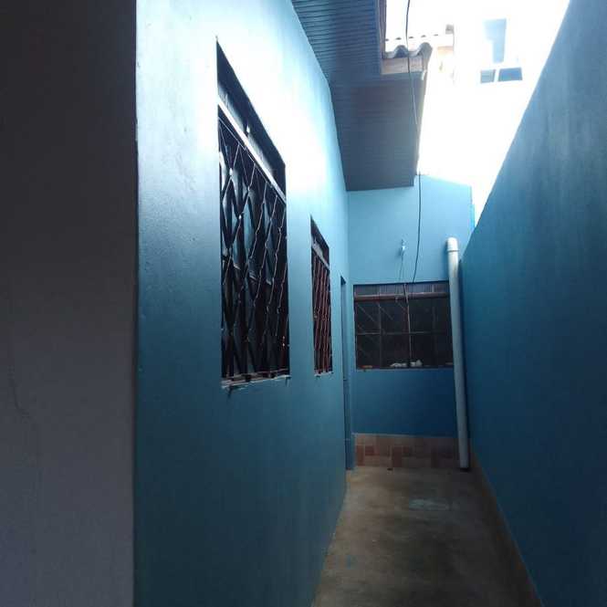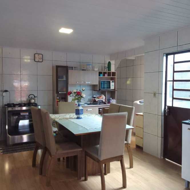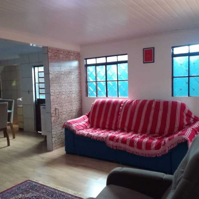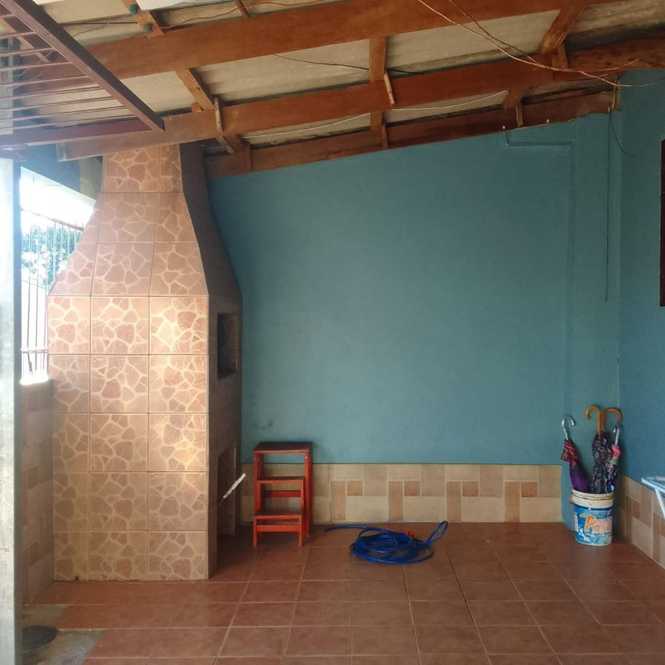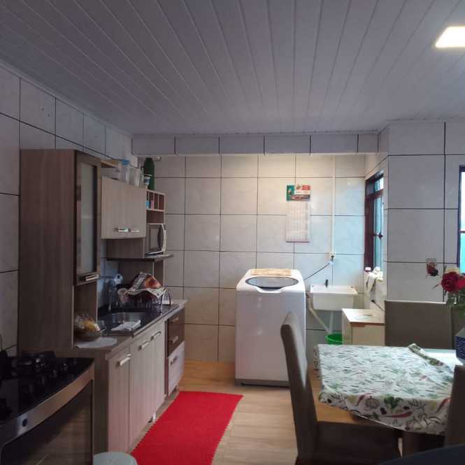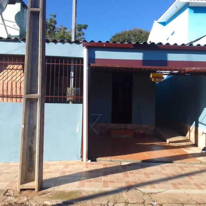 Casa de alvenaria com 2 dormitórios, sala, cozinha, garagem com churrasqueira, banheiro e lavanderia.