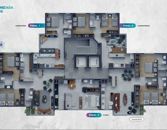 Opção de apartamentos studio, 1 dormitório, 2 dormitórios, 2 dormitórios com suíte e 2 dormitórios com 2 suítes.